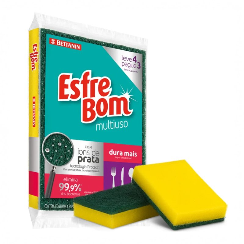 A Esponja Multiuso EsfreBom oferece alto desempenho em diversas tarefas de limpeza, combinando uma superfície macia com manta abrasiva verde que remove sujeiras difíceis sem danificar as superfícies. Conta com agente antibactericida NoBact, que proporciona maior higiene durante o uso. Com dimensões de 11 x 7,4 x 2,3 cm, é prática e confortável para manuseio manual. A embalagem promocional Leve 4 Pague 3 oferece quatro unidades pelo preço de três, garantindo mais economia e valor para o consumidor.