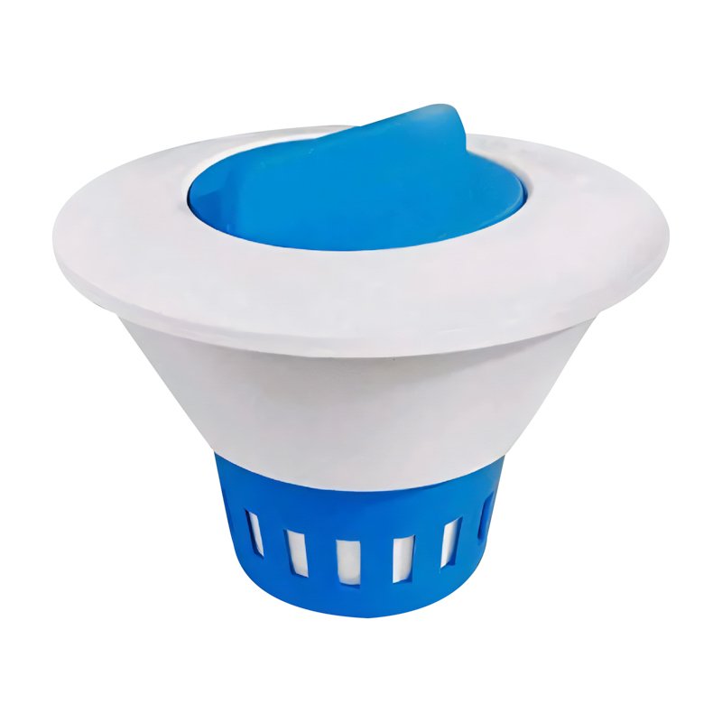 Clorador injetado em PS (Poliestireno), com tampa e cesto em PP (Polipropileno) para ser utilizado com tabletes ou pastilhas de 200g de Tricloro-S-Triazina-triona de baixa dissolução.