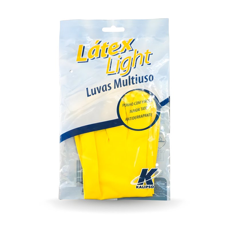 Luva Kalipso Látex Light Amarela é uma luva de proteção ocupacional em látex natural, com forro interno em algodão flocado e antiderrapante na palma e dedos, projetada para uso em tarefas que exigem proteção leve e boa destreza.