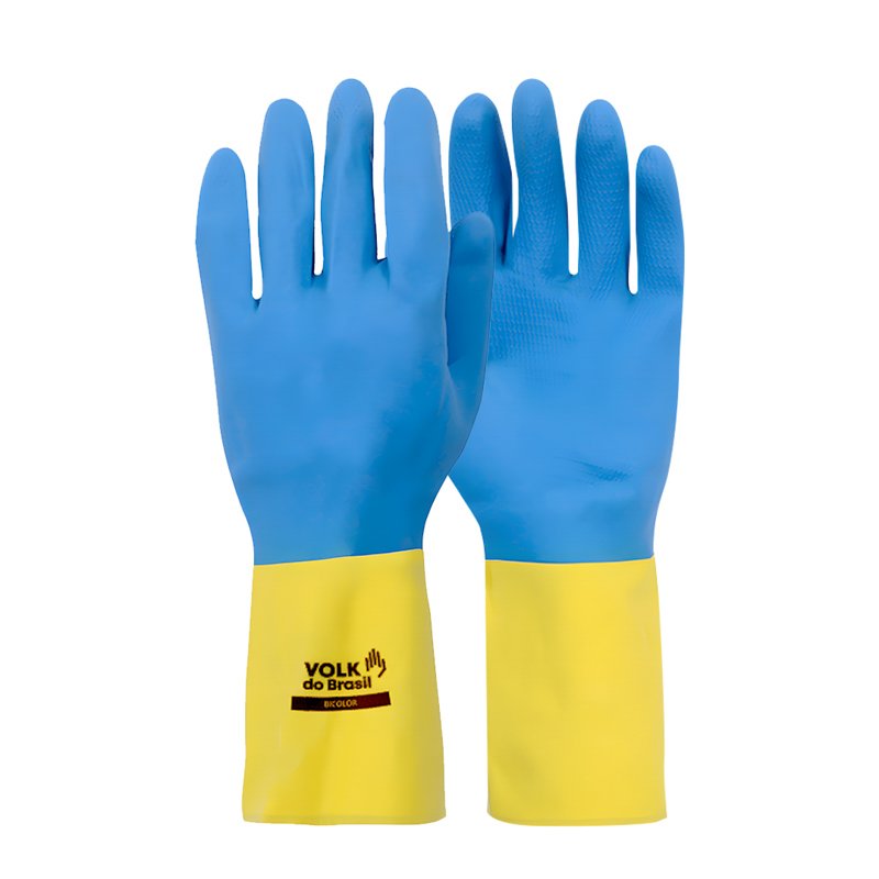 Luva Volk Bicolor é uma luva de proteção ocupacional em látex e neoprene, indicada para atividades que exigem aderência, resistência e conforto das mãos.