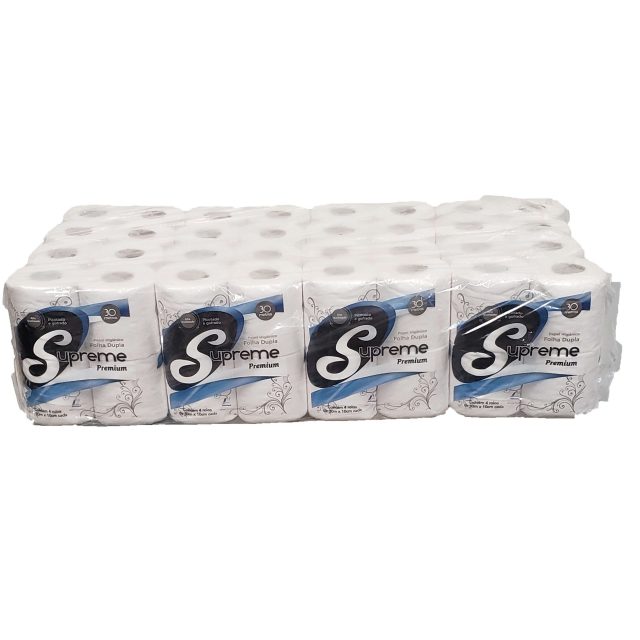 Papel higiênico folha dupla, com 64 rolos de 30 metros.