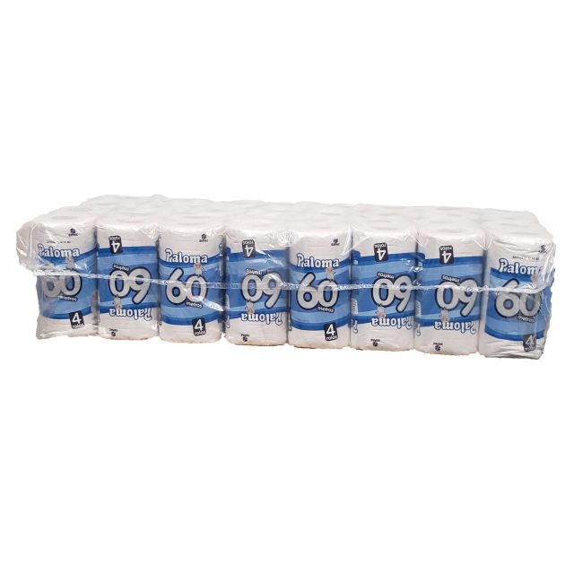 Papel higiênico folha simples, com 64 rolos de 60 metros.