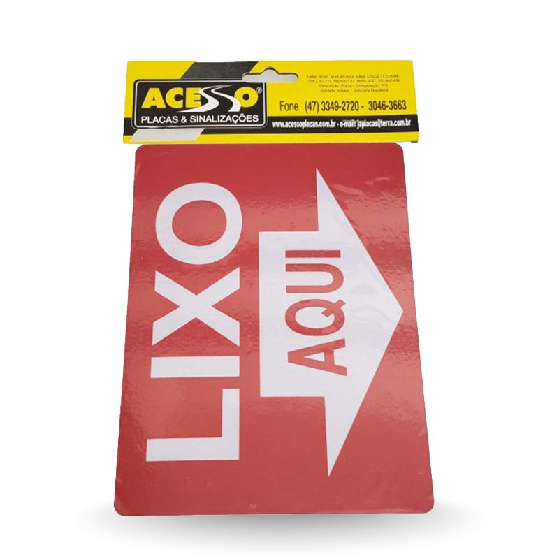 A Placa Lixo Aqui é uma sinalização visual desenvolvida para indicar de forma clara o local correto para descarte de resíduos. Indicada para ambientes comerciais, industriais, institucionais e áreas comuns, contribui para a organização, limpeza e correta destinação do lixo. Com dimensões de 20 x 15 cm, oferece boa visibilidade e leitura imediata, garantindo comunicação simples e eficiente para orientação do público.